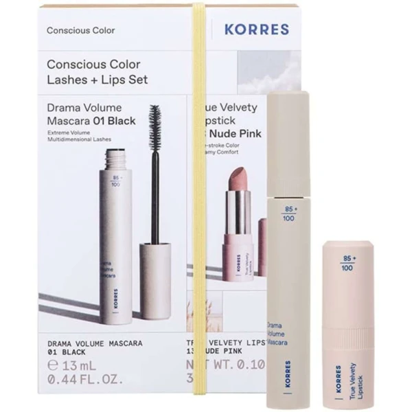 Korres Promo Consious Color Drama Volume Mascara 01 Black 13ml & True Velvety Lipstick 13 Nude Pink 3g